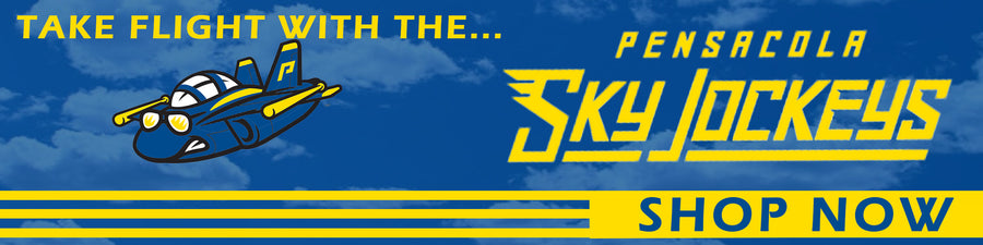 Fitting Pensacola’s status as the “Cradle of Naval Aviation,” the Sky Jockeys jersey features the team wordmark in a sharp, angular font to match livery on the F/A-18E/F Super Hornet flown by the Blue Angels. The cap features a fierce, anthropomorphic fighter jet sporting aviator sunglasses and baseball bats on its wingtips.